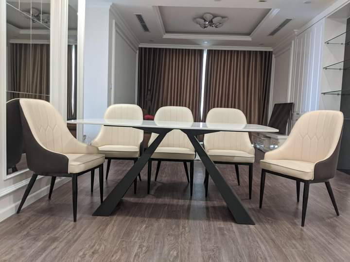 | Chất liệu: | khung bàn bằng sắt sơn tĩnh điện, mặt đá ceramic, ghế bọc da |